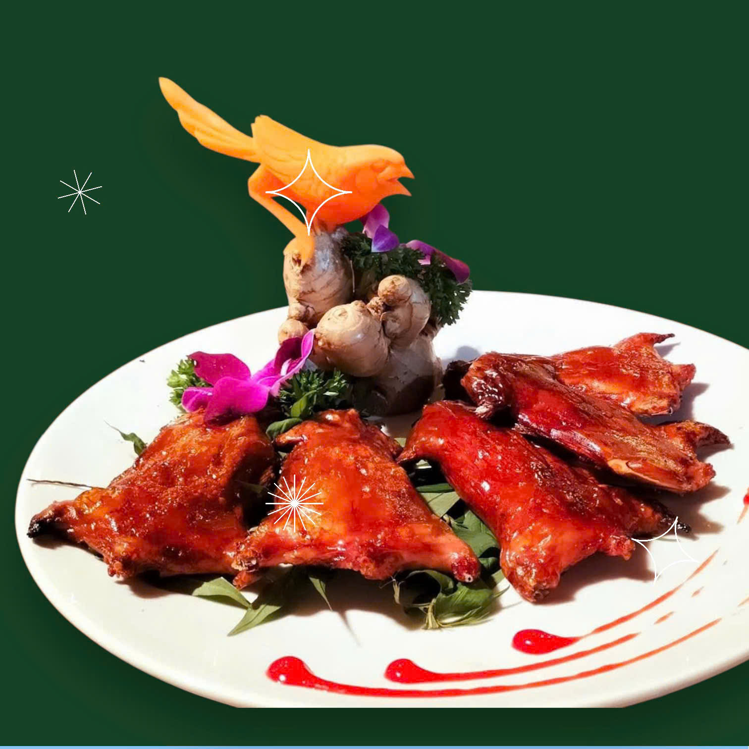 Món ăn được trình bày đẹp mắt, nghệ thuật với tạo hình chim hót từ cà rốt, điểm xuyết hoa tươi – không chỉ ngon mà còn khiến bạn muốn lưu lại từng khoảnh khắc.